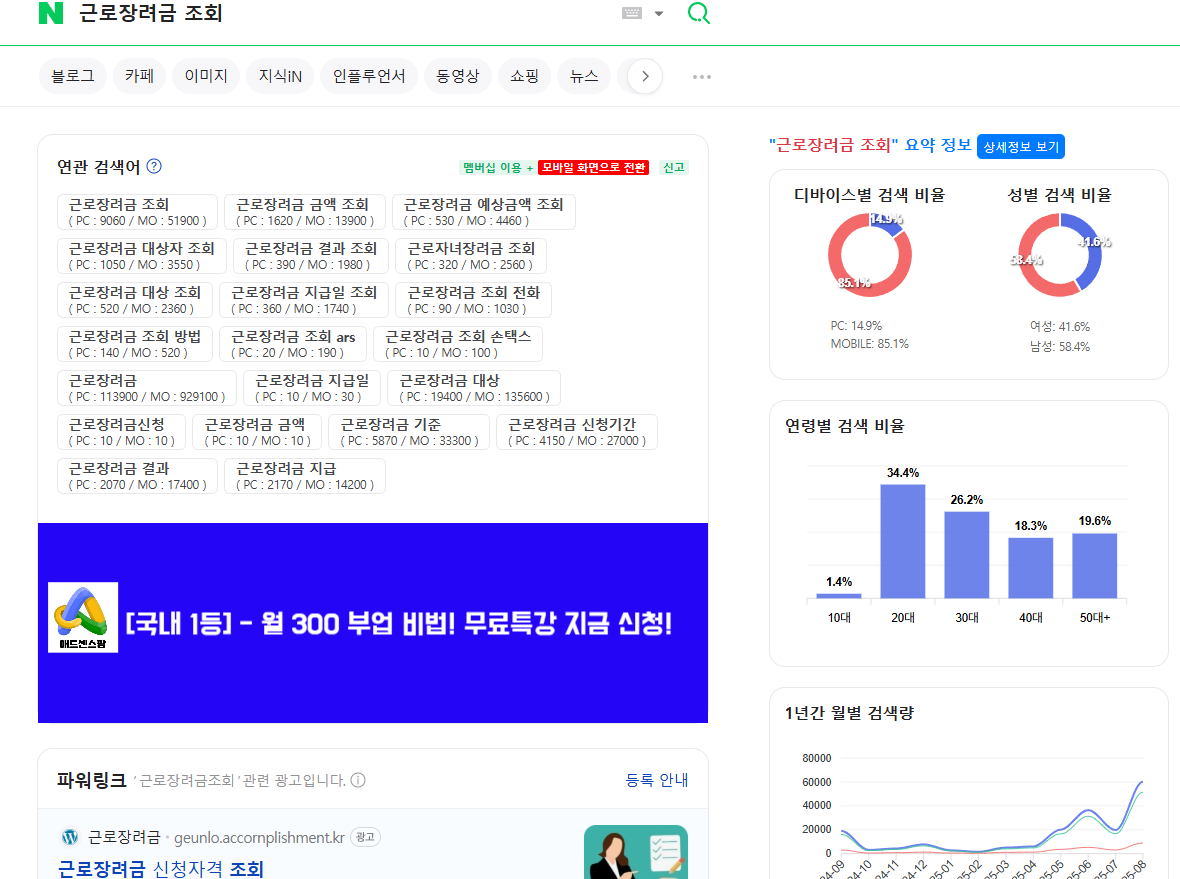 최근 네이버 데이터랩에 따르면 ‘근로장려금 조회’ 관련 키워드는 모바일 기준 85.1%의 높은 검색 비중을 보이며, 20~30대 사용자 비율이 60% 이상입니다.