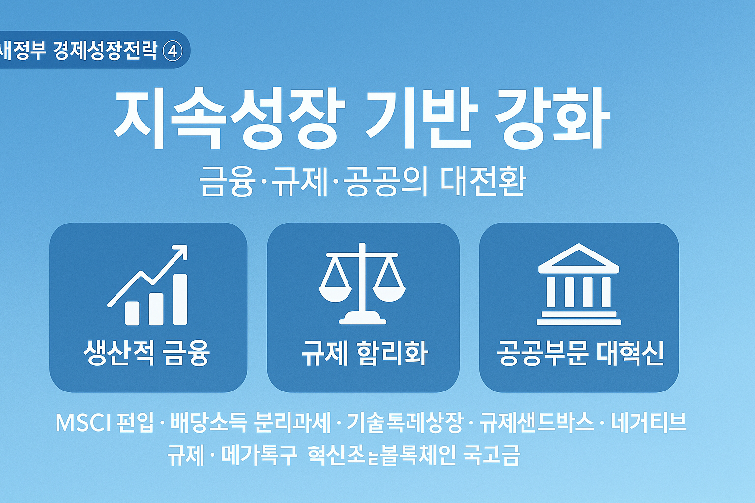 지속성장 기반 강화는 금융·규제·공공을 업그레이드해 민간 혁신투자로 자금을 연결하는 전략입니다. 우리 조직의 지배구조·규제·조달 체크리스트를 즉시 실행하고, 메가특구·혁신조달 등 참여 트랙을 선점하세요.