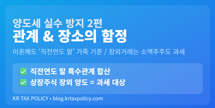 핵심 한 줄 — 세금 세계는 “그때의 가족(직전연도 말)”과 “어디서 팔았는지(장내/장외)”를 봅니다.