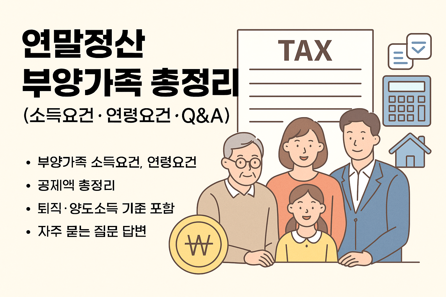 연말정산에서 가장 중요한 부분 중 하나가 부양가족 공제입니다. 누구를 공제받을 수 있고, 어떤 소득과 나이가 기준이 되는지 정확히 알아야 불이익을 피할 수 있습니다. 오늘은 연말정산 부양가족 소득요건, 연령요건, 공제액과 자주 묻는 질문(Q&A)까지 한눈에 정리해 드립니다.